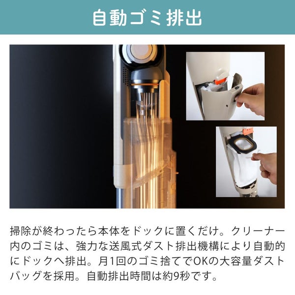 掃除が終わったら本体をドックに置くだけ。クリーナー内のゴミは、強力な送風式ダスト排出機構により自動的にドックへ排出。月1回のゴミ捨てでOKの大容量ダストバッグを採用。自動排出時間は約9秒です。