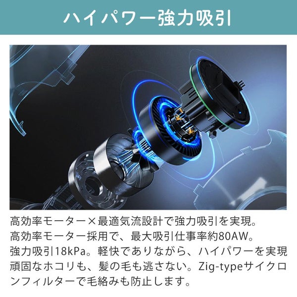 高効率モーター×最適気流設計で強力吸引を実現。高効率モーター採用で、最大吸引仕事率約80AW。強力吸引18kPa。軽快でありながら、ハイパワーを実現。頑固なホコリも、髪の毛も逃さない。Zig-typeサイクロンフィルターで毛絡みも防止します。