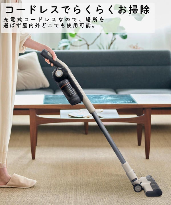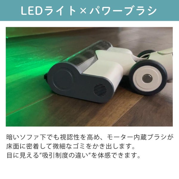 暗いソファ下でも視認性を高め、モーター内蔵ブラシが床面に密着して微細なゴミをかき出します。目に見える"吸引制度の違い"を体感できます。