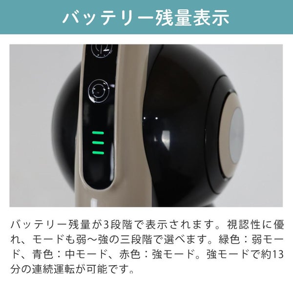 バッテリー残量が3段階で表示されます。視認性に優れ、モードも弱~強の三段階で選べます。緑色:弱モード、青色:中モード、赤色:強モード。強モードで約13分の連続運転が可能です。