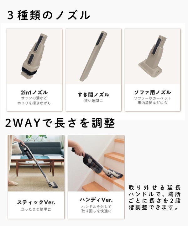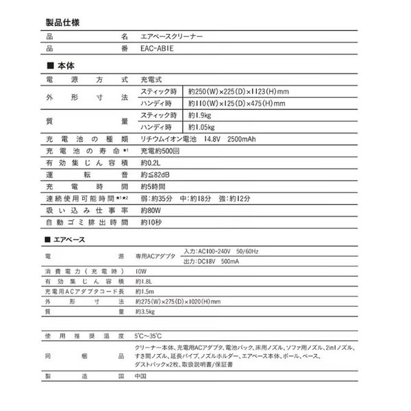 【付属品】電動パック、エアベース本体、延長パイプ、床用ノズル、ソファ用ノズル、2in1ノズル、すき間ノズル、ノズルホルダー、ボールベース、ACアダプター、ダストパック×2、取扱説明書、保証書