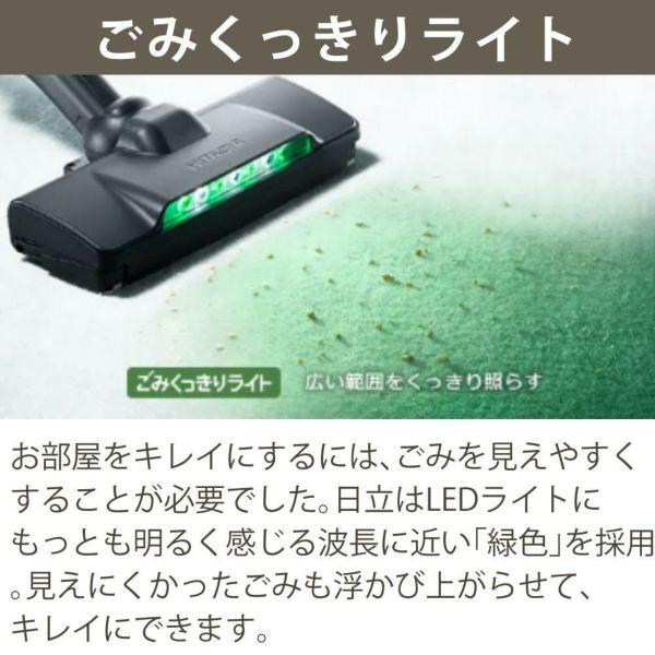 お部屋をキレイにするには、ごみを見えやすくすることが必要でした。日立はLEDライトにもっとも明るく感じる波長に近い「緑色」を採用。見えにくかったごみも浮かび上がらせて、キレイにできます。