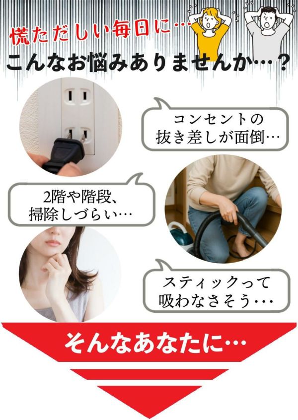 | 付属品 | ハンディブラシ、伸縮すき間用吸口、布用ブラッシングヘッド、ほうきブラシ、延長パイプ、スタンド式充電台、ACアダプター、お手入れブラシ |