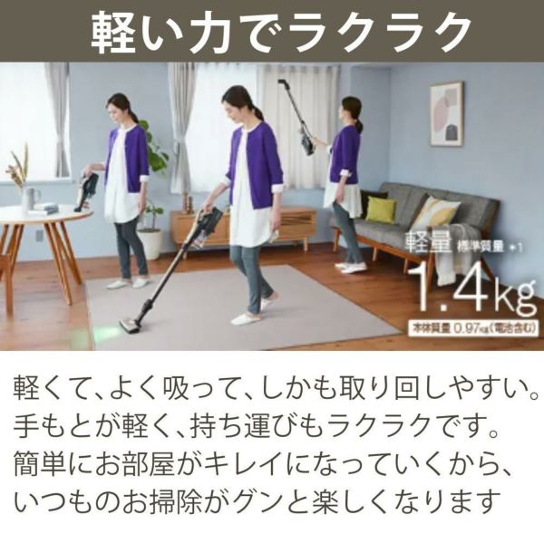 軽くて、よく吸って、しかも取り回しやすい。手もとが軽く、持ち運びもラクラクです。簡単にお部屋がキレイになっていくから、いつものお掃除がグンと楽しくなります。