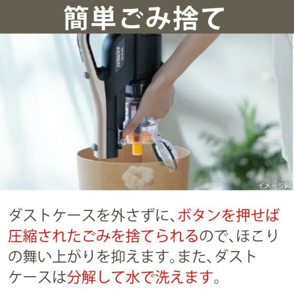 ダストケースを外さずに、ボタンを押せば圧縮されたごみを捨てられるので、ほこりの舞い上がりを抑えます。また、ダストケースは分解して水で洗えます。