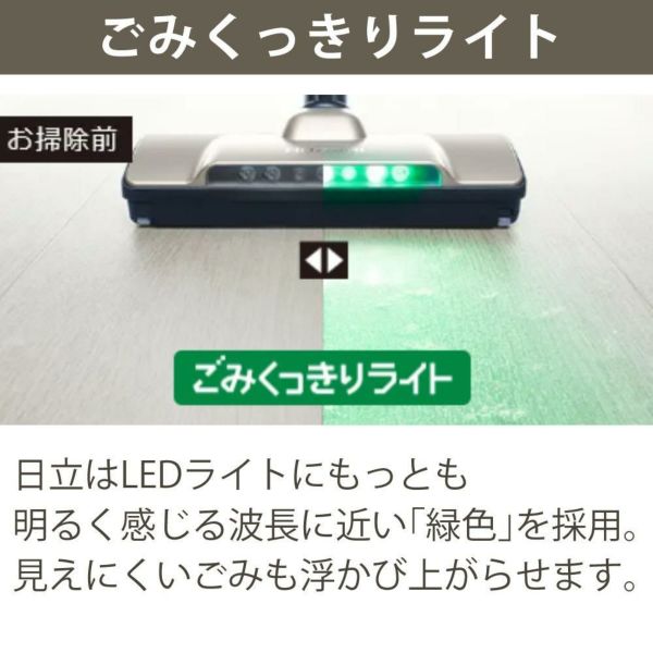 緑色LEDライトで、見えにくいごみも浮かび上がらせます。お部屋をキレイにするには、ごみを見えやすくすることが必要でした。日立はLEDライトにもっとも明るく感じる波長に近い「緑色」を採用。見えにくかったごみも浮かび上がらせて、キレイにできます。