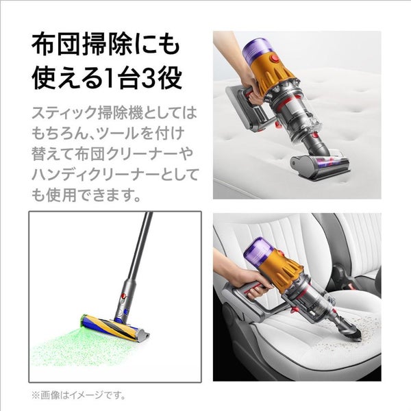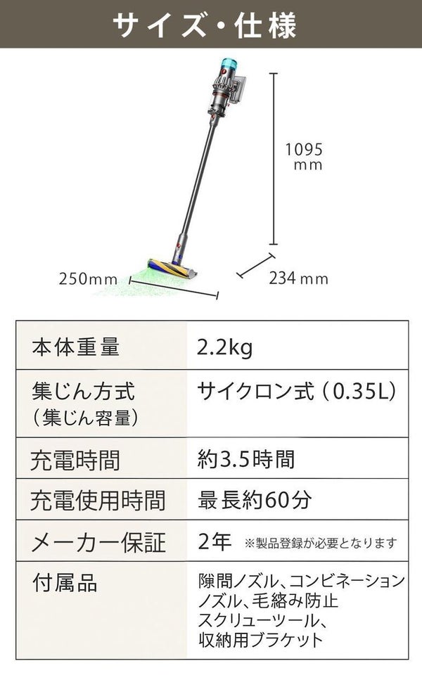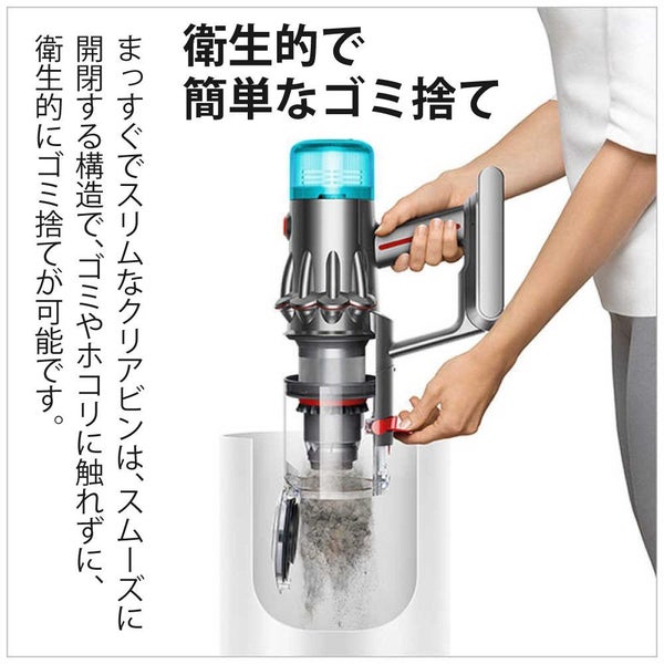 *2024年4月時点で販売中の質量2.5kg以下のダイソンのコードレススティッククリーナーとの比較。IEC(国際電気標準会議)規格62885-45.8,5.9に準拠した、クリアビンがゴミ満量時に強モードで使用した場合の自社による吸引力試験(2020年に実施)。