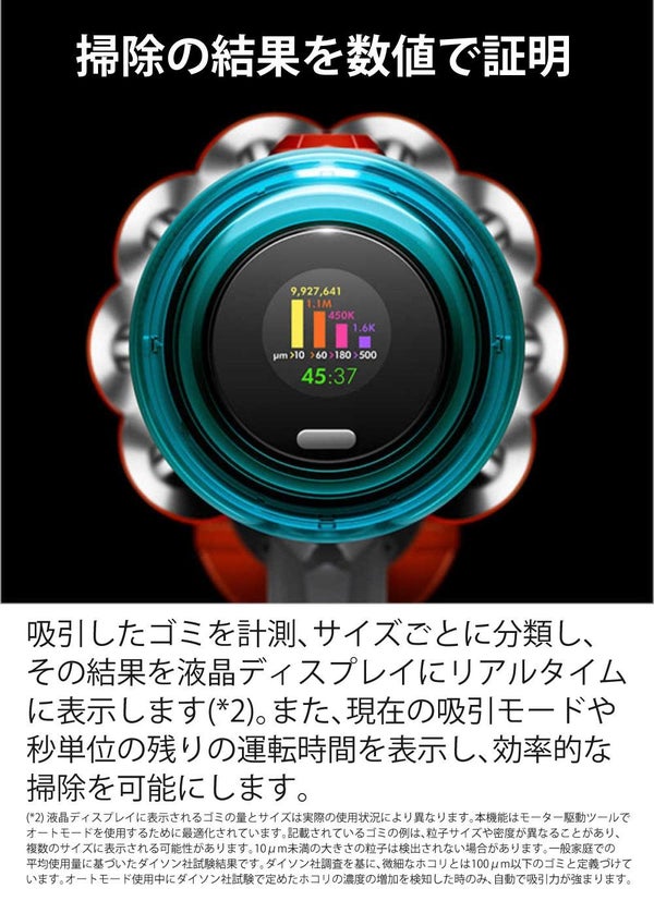 *液晶ディスプレイに表示されるゴミの量とサイズは実際の使用状況により異なります。本機能はモーター駆動ツールでオートモードを使用するために最適化されています。記載されているゴミの例は、粒子サイズや密度が異なることがあり、複数のサイズに表示される可能性があります。10μm未満の大きさの粒子は検出されない場合があります。一般家庭での平均使用量に基づいた自社試験結果です。自社調査を基に、微細なホコリとは100μm以下のゴミと定義づけています。オートモード使用中に自社試験で定めたホコリの濃度の増加を検知した時のみ、自動で吸引力が強まります。