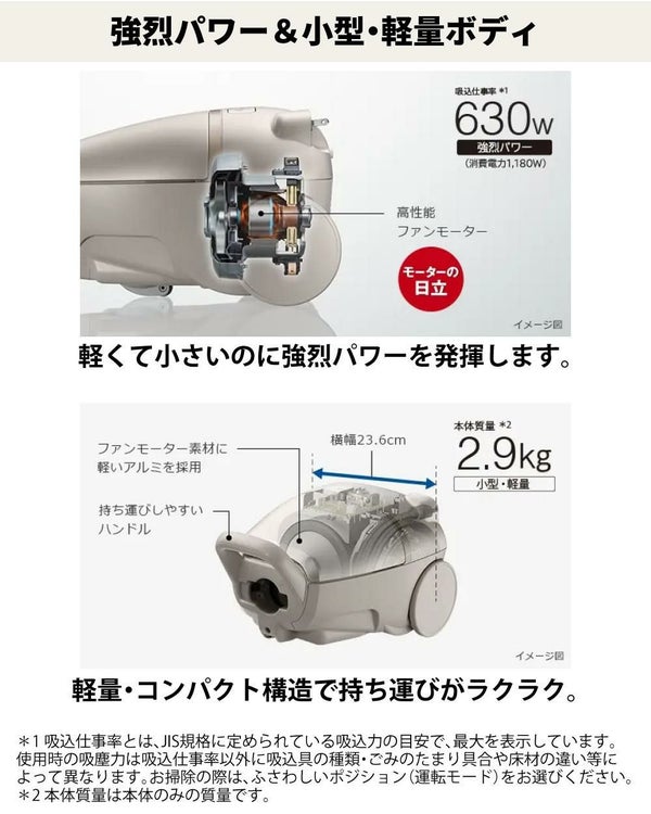 *1 吸込仕事率とは、JIS規格に定められている吸込力の目安で、最大を表示しています。使用時の吸塵力は吸込仕事率以外に吸込具の種類・ごみのたまり具合や床材の違い等によって異なります。お掃除の際は、ふさわしいポジション(運転モード)をお選びください。