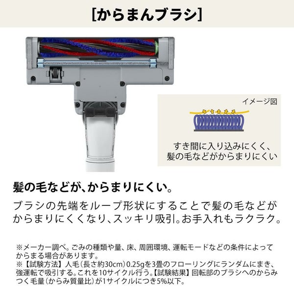 *3 【試験方法】人毛(長さ約30cm)0.25gを3畳のフローリングにランダムにまき、強運転で吸引する。これを10サイクル行う。【試験結果】 回転部のブラシへのからみつく毛量(からみ質量比)が1サイクルにつき5%以下。