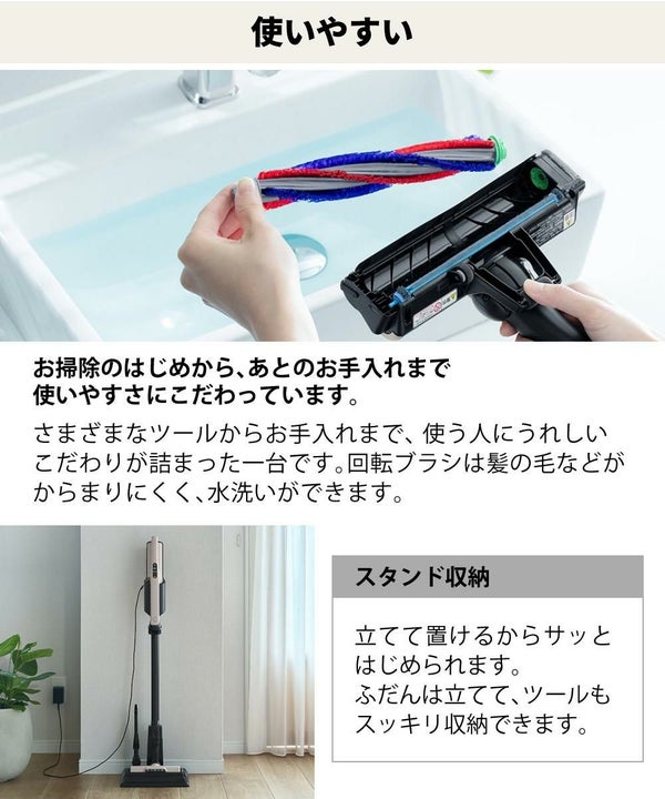 ※一般的にコードレスタイプのクリーナーは、コード付きタイプのクリーナーに比べて吸い込む力に差があります。ただし、集じん性能を高めるためにモーター駆動の回転ブラシを採用しています。