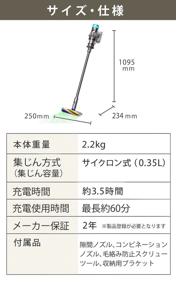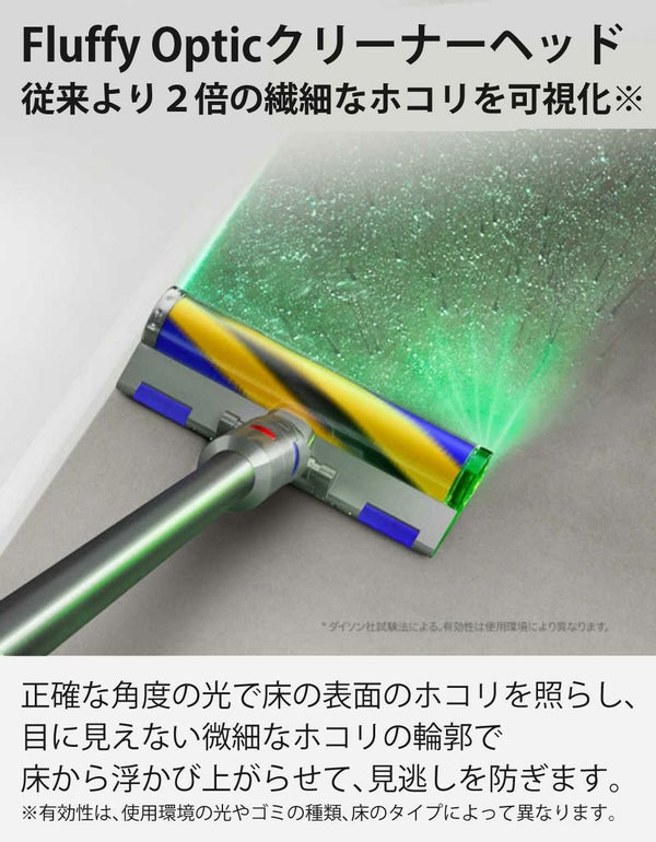 *2024年4月時点で販売中の質量2.5kg以下のダイソンのコードレススティッククリーナーとの比較。IEC(国際電気標準会議)規格62885-45.8,5.9に準拠した、クリアビンがゴミ満量時に強モードで使用した場合の自社による吸引力試験(2020年に実施)。