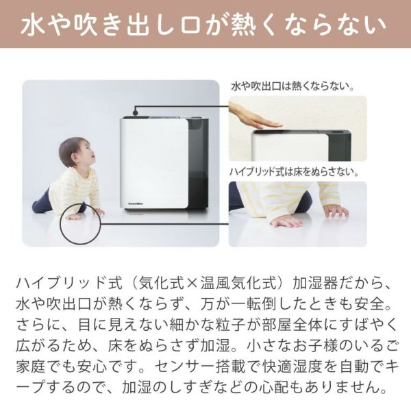 ハイブリッド式(気化式×温風気化式)だから、水や吹き出し口が熱くならない。センサー搭載で快適湿度を自動でキープするので、加湿のしすぎなどの心配もありません。