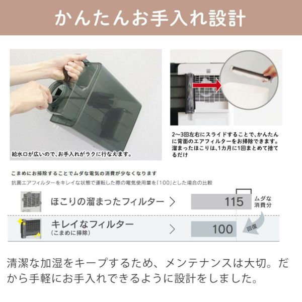 清潔な加湿をキープするため、メンテナンスは大切。だから手軽にお手入れできるように設計をしました。