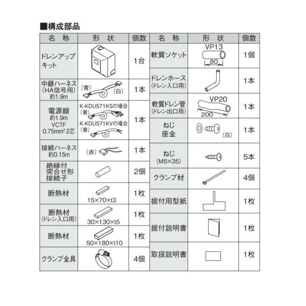 ドレンアップキット1本 中継ハーネス(HA信号用約1.9m 電源線約1.9m VCTF0.75ミリ平方メートル2芯1本 接続ハーネス約0.15m 1本 絶縁付突合せ形接続子2個 断熱材15×70×t3 1枚 断熱材(ドレン入口用)30×130×t5 1枚 断熱材 50×180×t10 1枚 クランプ金具4個 軟質ソケットVP13 長さ80 1個 ドレンホース(ドレン入口用)1本 軟質ドレン管(ドレン出口管) ねじ座金 ねじ(M5×35) クランプ材 据付用型紙 据付説明書 取扱説明書 |
