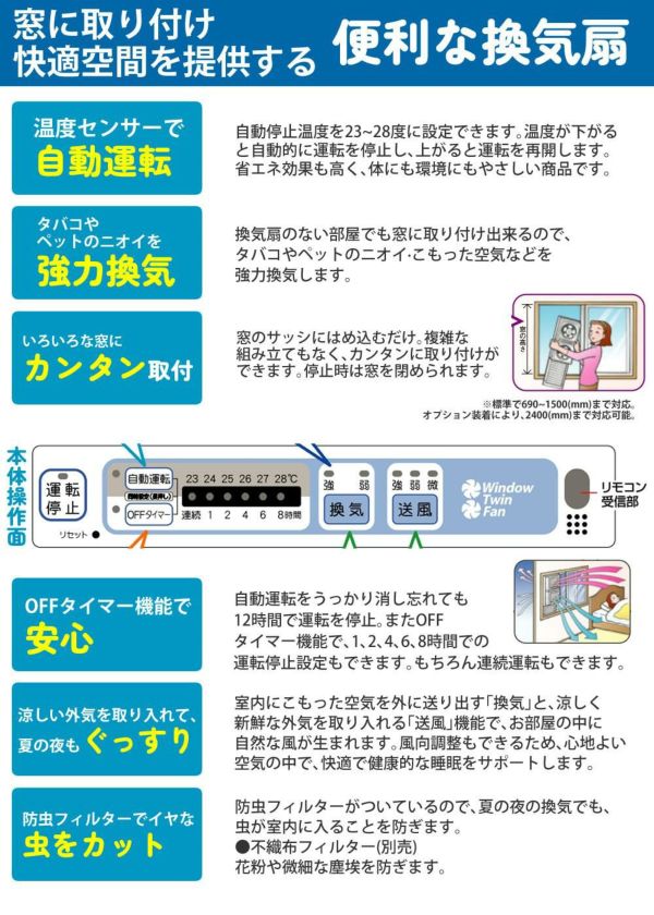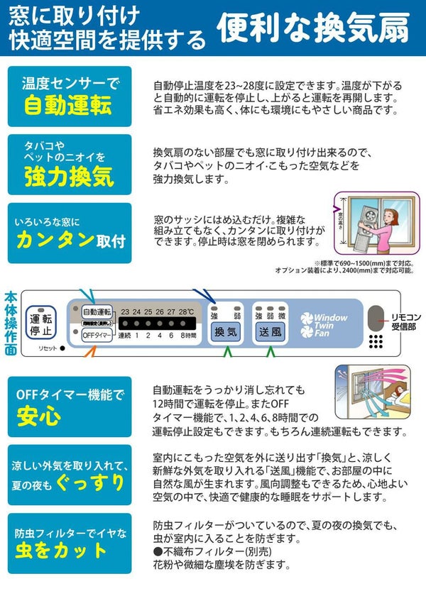 | 取付可能窓枠高(mm) | 690~1500(2400mmまで延長可能) |