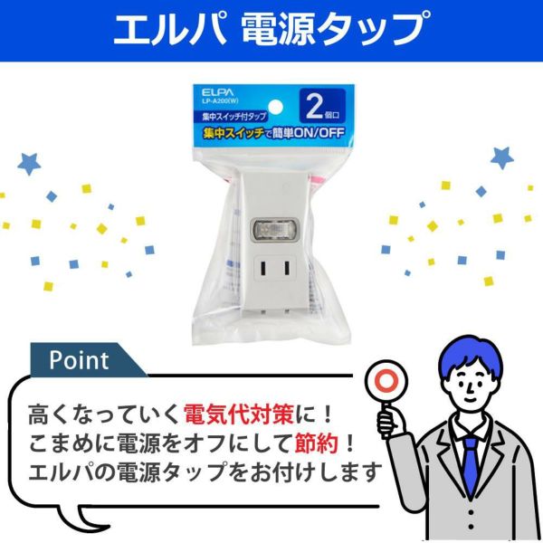 | 3)エルパ 電源タップ 集中スイッチ 2個口 ホワイト LP-A200(W) |