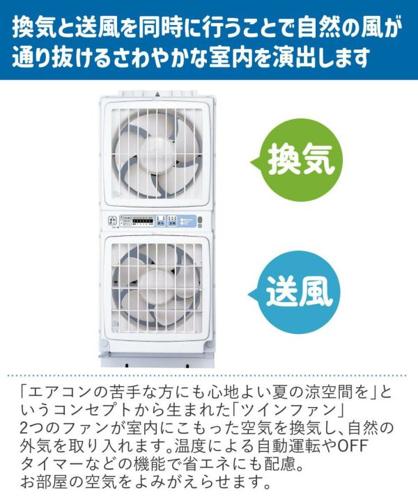 窓 に 取り付け できる 窓用 ツインファン 「 FMT-200SM 」 は、 同時給排形 で 効率よく 空気を 入れ替え ます。 コンパクト な デザイン で、 狭い スペース にも 設置 可能。 便利 な ミニリモコン付きタイプ で、 離れた 場所 からも 操作 できます。 夏場 の 換気 や 冬場 の 結露 対策 にも 活躍 する 窓用 ファン です。