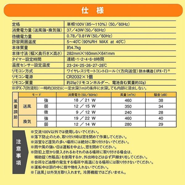 | 消費電力量(送風強・換気強) | 37/43W(50/60Hz) |
