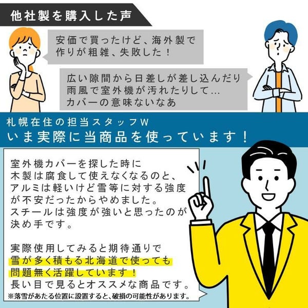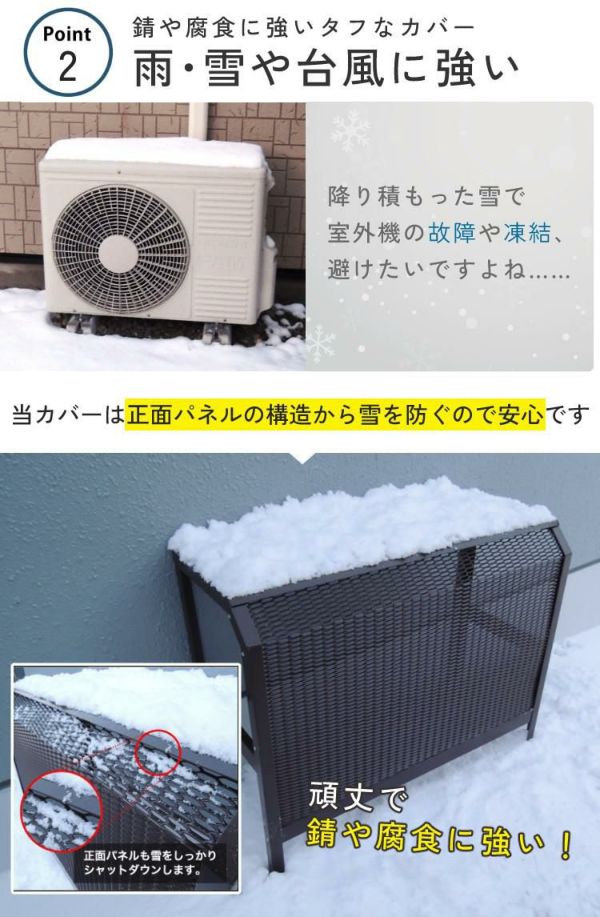 降り積もった雪で室外機の故障や凍結は避けたいものです。本製品は正面パネルの構造から雪を防ぎます。丈夫なスチール製なので、雪の多い地域の方にご愛用いただいています。