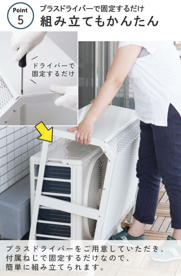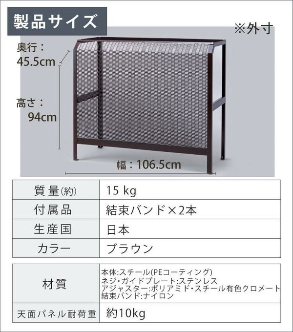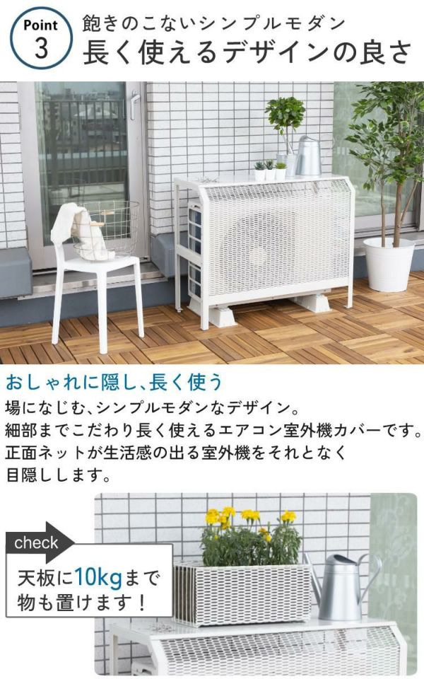 室外機を隠すことで、生活感を消すことができるシンプルな飽きのこないデザイン。天板に10kgまで物も置けます!天面に滑り止めやフチなどはついておりません。物を載せてご使用になる場合は、落下に十分ご注意ください。
