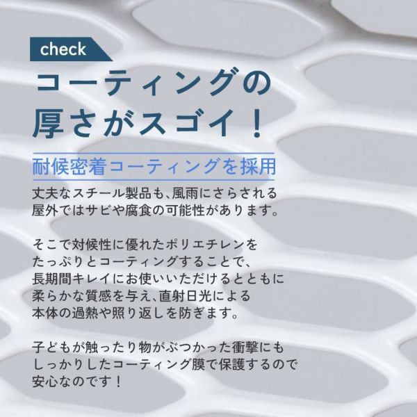 丈夫なスチール製品も、雨風にさらされる屋外ではサビや腐食の可能性があります。対候性に優れたポリエチレンをコーティングすることで、長期間キレイにお使いいただけます。柔らかな質感を与え、直射日光による本体の過熱や照り返しを防ぎます。