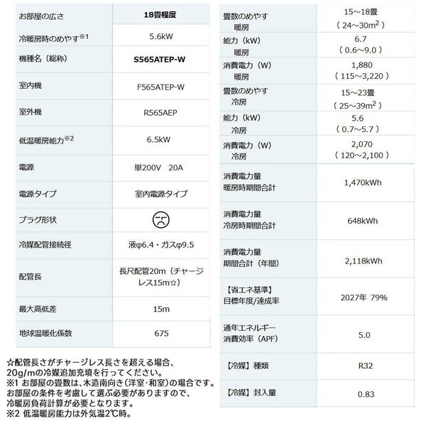 | 18畳程度 | S565ATEP-W | AN565AEP-W |