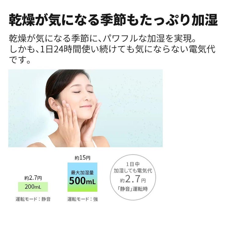 | 加湿適用床面積 | プレハブ洋室 ~14畳(23m2) 木造和室 ~8.5畳(14m2) |