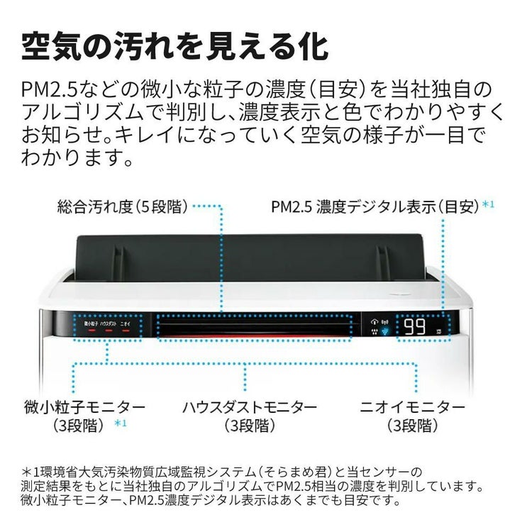 | モニター | 微小粒子/ハウスダスト/ニオイ/PM2.5濃度デジタル表示(目安)/きれいモニター/デジタル温湿・電気代 |