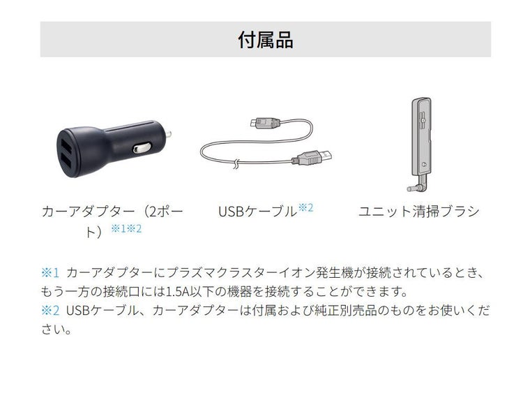 カーアダプター(2ポート)、USBケーブル、ユニット清掃ブラシ |