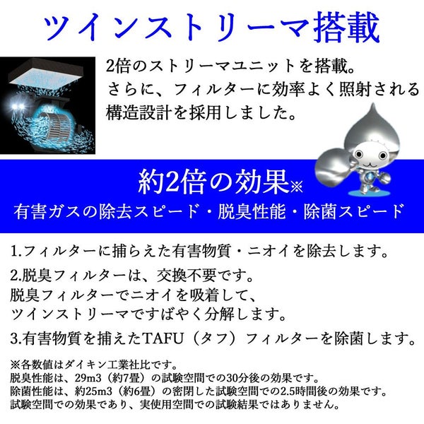 標準のストリーマの2倍搭載し、フィルターに効率よく照射する構造設計。有害ガスの除去スピードは約2倍、脱臭性能は約2倍、除去スピードは約2倍です。