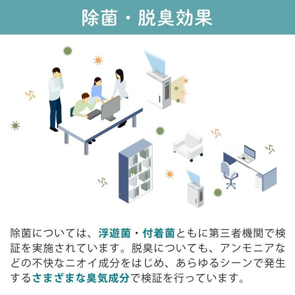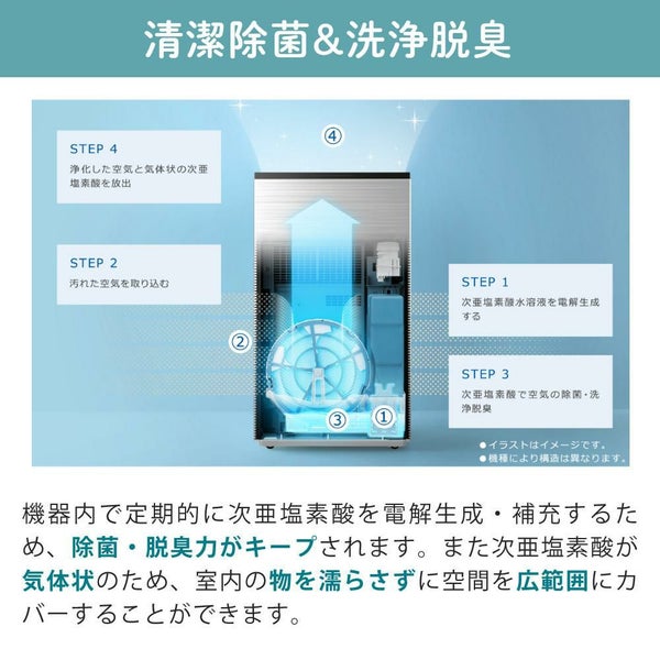 「次亜塩素酸 空間除菌脱臭機」は、食塩水を電気分解することで、「次亜塩素酸」を生成して、空間の除菌※・脱臭をします。※〈付着菌〉約9畳での約12時間後の効果です。実使用空間での実証結果ではありません。