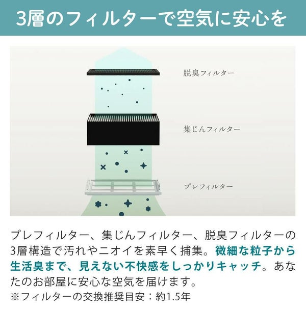 | フィルター | 集じんフィルター(交換目安:約1.5年間) / 脱臭フィルター(交換目安:約1.5年間) / プレフィルター(フィルターケースカバーに付属) |