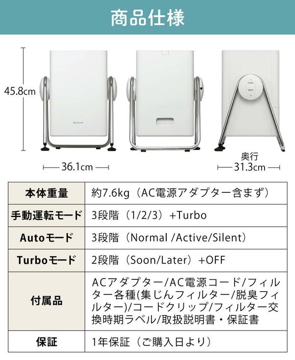【付属品】ACアダプター、AC電源コード、フィルター各種(集じんフィルター/脱臭フィルター)、コードクリップ、フィルター交換時期ラベル、取扱説明書・保証書 |
