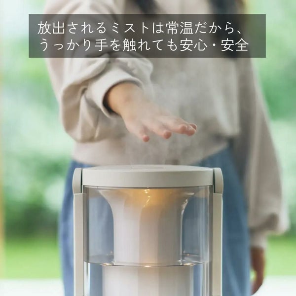 好評の超音波式プールレス加湿器「MIST 350」のコンパクトサイズ版として登場。適用畳数最大7畳の空間を加湿し、寝室や子供部屋などのパーソナルな居室などプライベート空間で使用できる「洗いやすさ」と「使いやすさ」をさらに追求した加湿器です。
