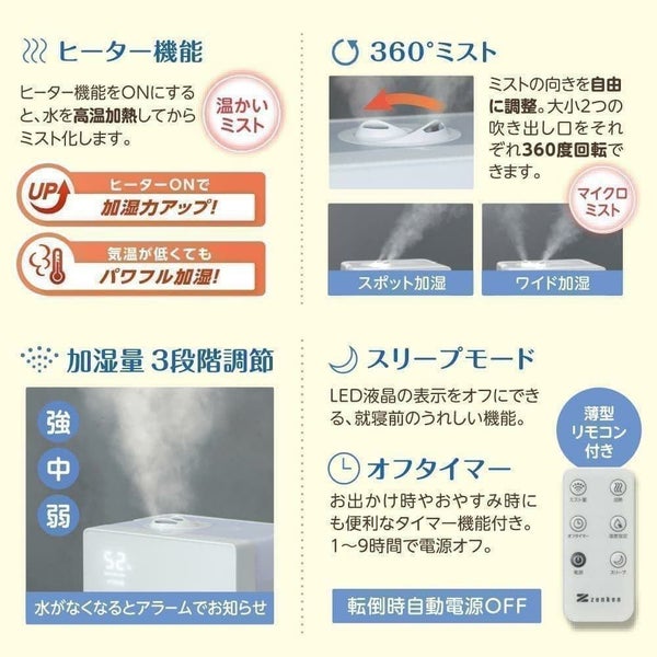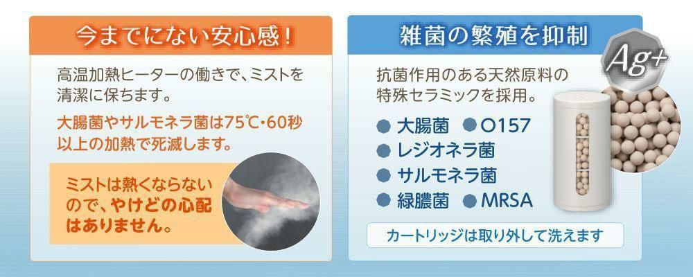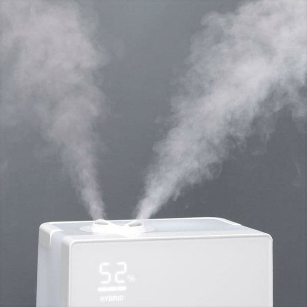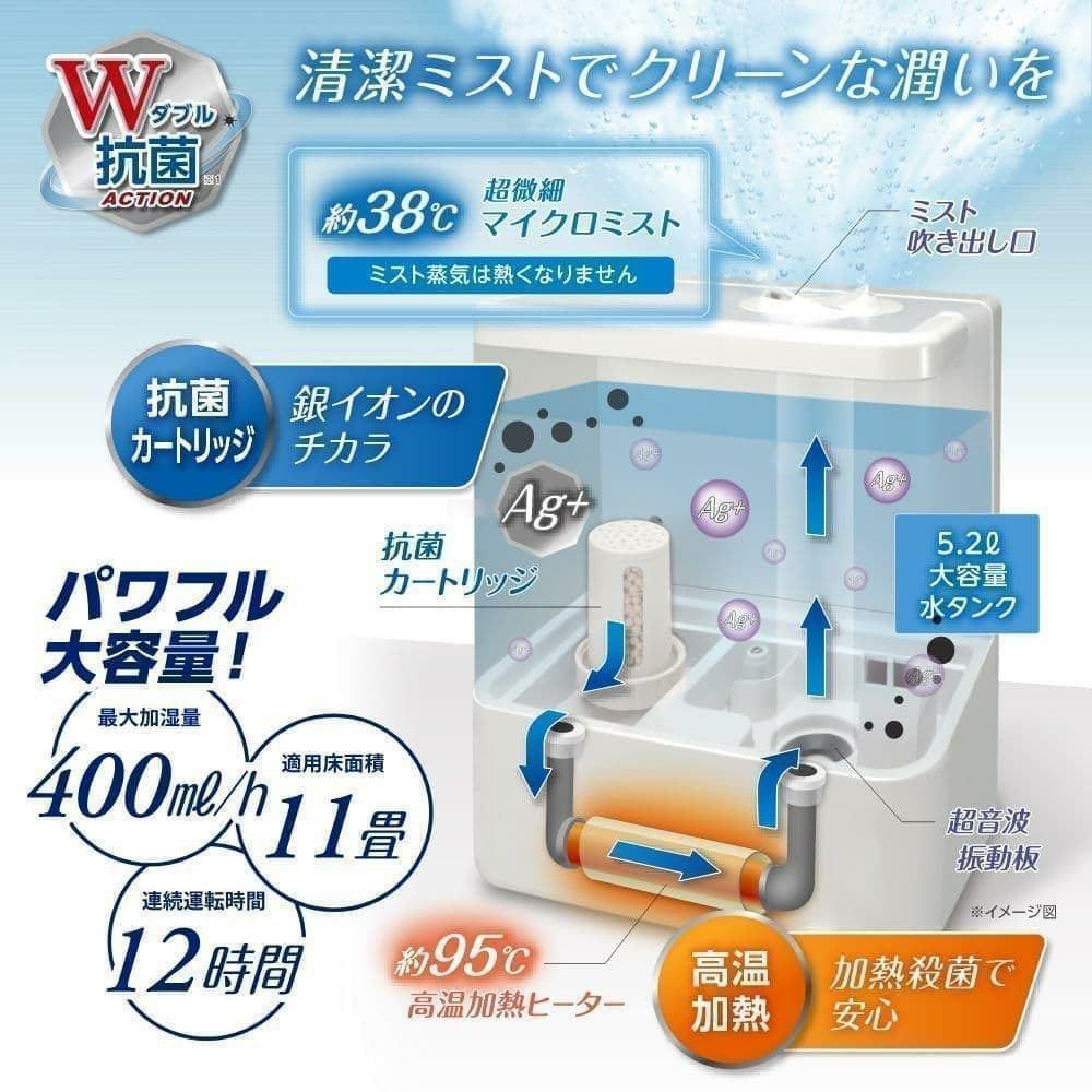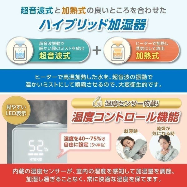 ●ハイブリッド方式の加湿器 超音波式 + ヒーター搭載のハイブリッド方式の加湿器です。 ●温かいミストで快適加湿 ヒーターで高温加熱した水を超音波の振動できめ細やかな温かいミストにして噴霧します。 ●ダブル抗菌アクション 高温加熱・タンク内抗菌で加湿器内部の雑菌の繁殖を抑えています。*1 ●大パワー & 湿度コントロール機能 最大加湿量400ml/hの大パワー設計、湿度コントロール機能搭載でワンランク上の快適空間を演出します。 *1 すべての菌に対する効果を保証するものではありません。