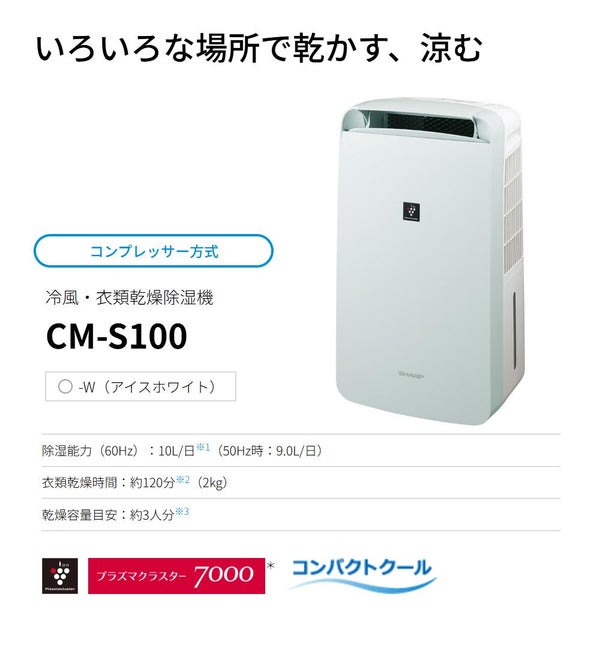 ▼シャープ 冷風衣類乾燥除湿機 CM-S100-W アイスホワイト