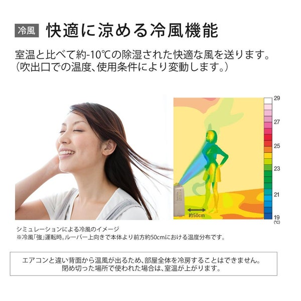 室温と比べて約-10℃の除湿された快適な風を送ります。(吹出口での温度、使用条件により変動します。)