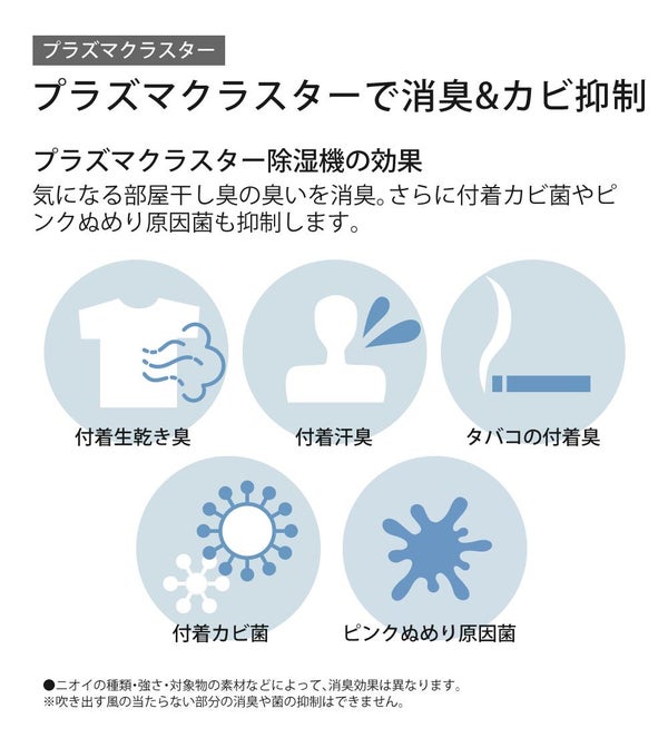 部屋干し衣類のイヤな臭いを、プラズマクラスターが抑制します。