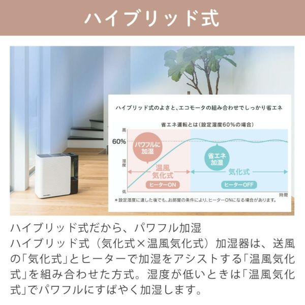 ハイブリッド式加湿器は、送風の「気化式」とヒーターで加湿をアシストする「温風気化式」を組み合わせた方式。湿度が低いときは「温風気化式」でパワフルにすばやく加湿します。 湿度に応じて2つの方式を賢く使い分けるので省エネです。