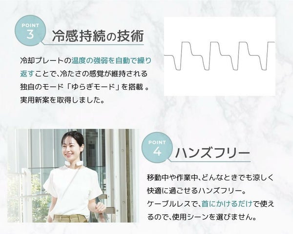 また、強~弱を自動で繰り返す「ゆらぎモード」を搭載しているため、缶飲料を当てたような冷たさをいつまでも体感できます。