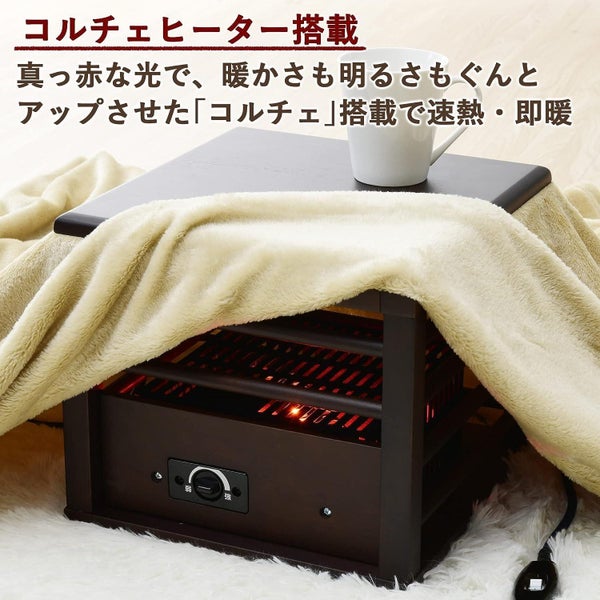 一人暮らし にぴったりの ミニこたつ なので、幅 30×30cm の 正方形こたつ テーブルとして リビング や テレワーク 空間 にも最適です。コルチェヒーター を搭載し 速暖・速熱 を実現、ヒーター100W の省エネ仕様で、軽量3.9kg だから 持ち運びラクラク。天板付きこたつ モデルなので 滑り落ち防止天板 付きで 安全装置付き(温度ヒューズ・電流ヒューズ)も備え、無段階温度調節 や 中間スイッチ で使いやすさも抜群。足元暖房スタイルの 頭寒足熱 効果 もあって、こたつ布団 を使えば 快適な冬のひとり時間が過ごせます。