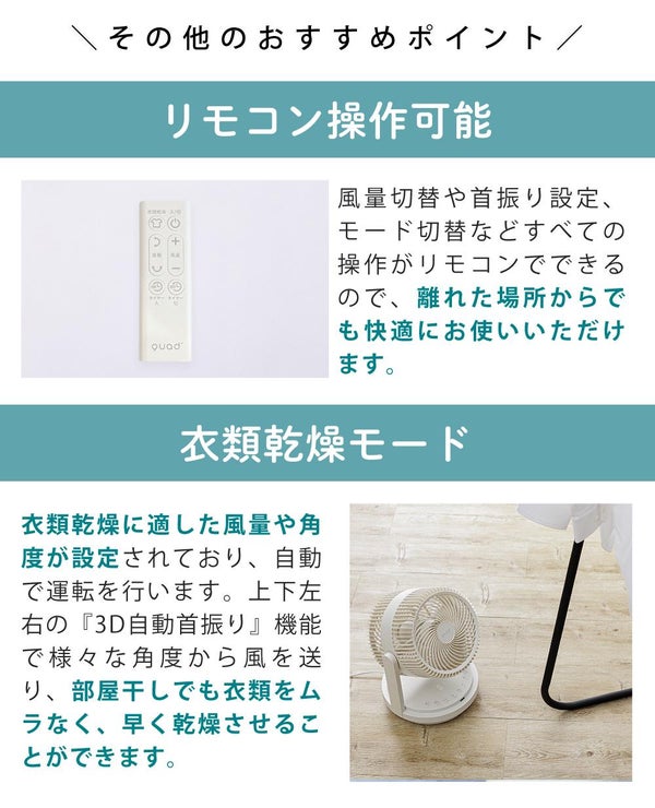 衣類乾燥に適した風量や角度が設定されており、自動で運転を行います。上下左右の『3D自動首振り』機能で様々な角度から風を送り、部屋干しでも衣類をムラなく、早く乾燥させることができます。