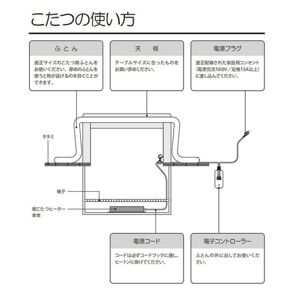 こたつのやぐら(囲い部分)や炉箱に本体が正しく収まるように設置し、コードやコントローラーに異常がないか確認してください。