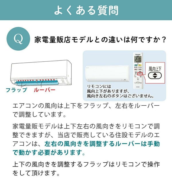 家電量販店モデル:家電量販店で一般のお客様向けに販売されているモデルです。家電量販店モデルの風向調整は上下左右ともにリモコンで調整が可能です。