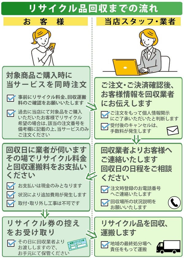 当サービスは、当店でエアコンをご購入いただいたお客様を対象に、リサイクル回収業者への取次ぎを行います。