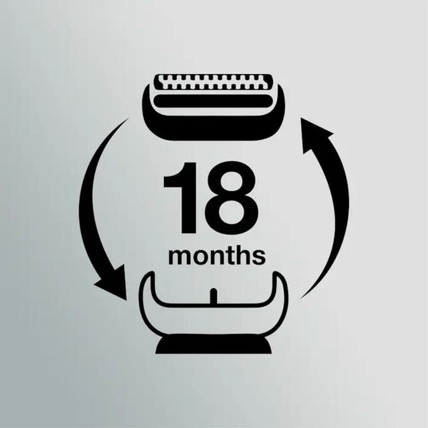 ブラウンでは、長く快適にお使いいただくために替え刃を約18ヶ月ごと1に交換することをお勧めしています。