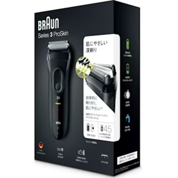朝の身支度を効率化したい ビジネスマン や 敏感肌 の方におすすめの Braun シリーズ3 3020s?B は、 肌にやさしい 3カットシステム を採用した 充電式 シェーバー です。 マイクロコーム が ヒゲ を効率よく捕らえ、 サスペンションヘッド により顔の輪郭にしっかりフィットして スムーズ な 深剃り を実現。 防水設計( IPX7 )で 丸ごと水洗い でき、 手入れ簡単 かつ 清潔感 を保てます。 約1時間の 速攻充電 で 最大45分駆動 を可能にし、急ぎの朝も安心。 100?240V の 海外対応 電圧で 出張 や 旅行 にも便利です。 LEDディスプレイ で バッテリー残量 をひと目で確認でき、 ゴムグリップ がしっかりとしたホールド感を提供。 軽量 かつ コンパクト な設計で、 トラベル対応 の シェーバー を探している方にも最適です。 スタイリッシュな ブラック ボディが毎日の シェービング をスマートにサポートします。