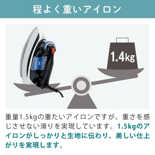重量1.5kgの重たいアイロンですが、重さを感じさせない滑りを実現しています。1.5kgのアイロンがしっかりと生地に伝わり、美しい仕上がりを実現します。