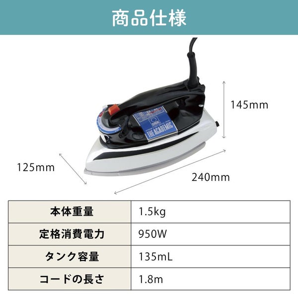 25年以上変わらぬデザインで愛用され続けているドイツD.B.K. ブランド「THE ACADEMIC」。セラミックコーティングされた掛け面は熱伝導率が高いアルミ製熱板を使用。また、25個の孔から強力スチームを噴射し、1.5kgの本体重量でプレスしながらアイロン掛けができるため、ムラの無い美しい“仕上がり”を実現します。